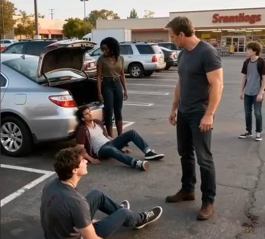 The rest of them froze. One tried to intervene, tripped on a shopping cart, and fell to his knees. The laughter was gone. The bravado dissolved. The parking lot went dead quiet.