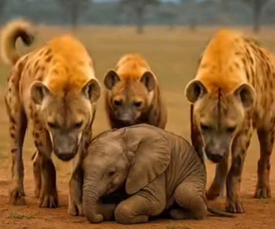 The calf froze, instinct urging him to make himself look bigger. He spread his small ears wide and let out a trembling trumpet that shook the grass. The hyenas laughed — a chilling, mocking chorus that sliced through the air. One lunged forward, snapping at his legs, another darted behind to nip at his tail.